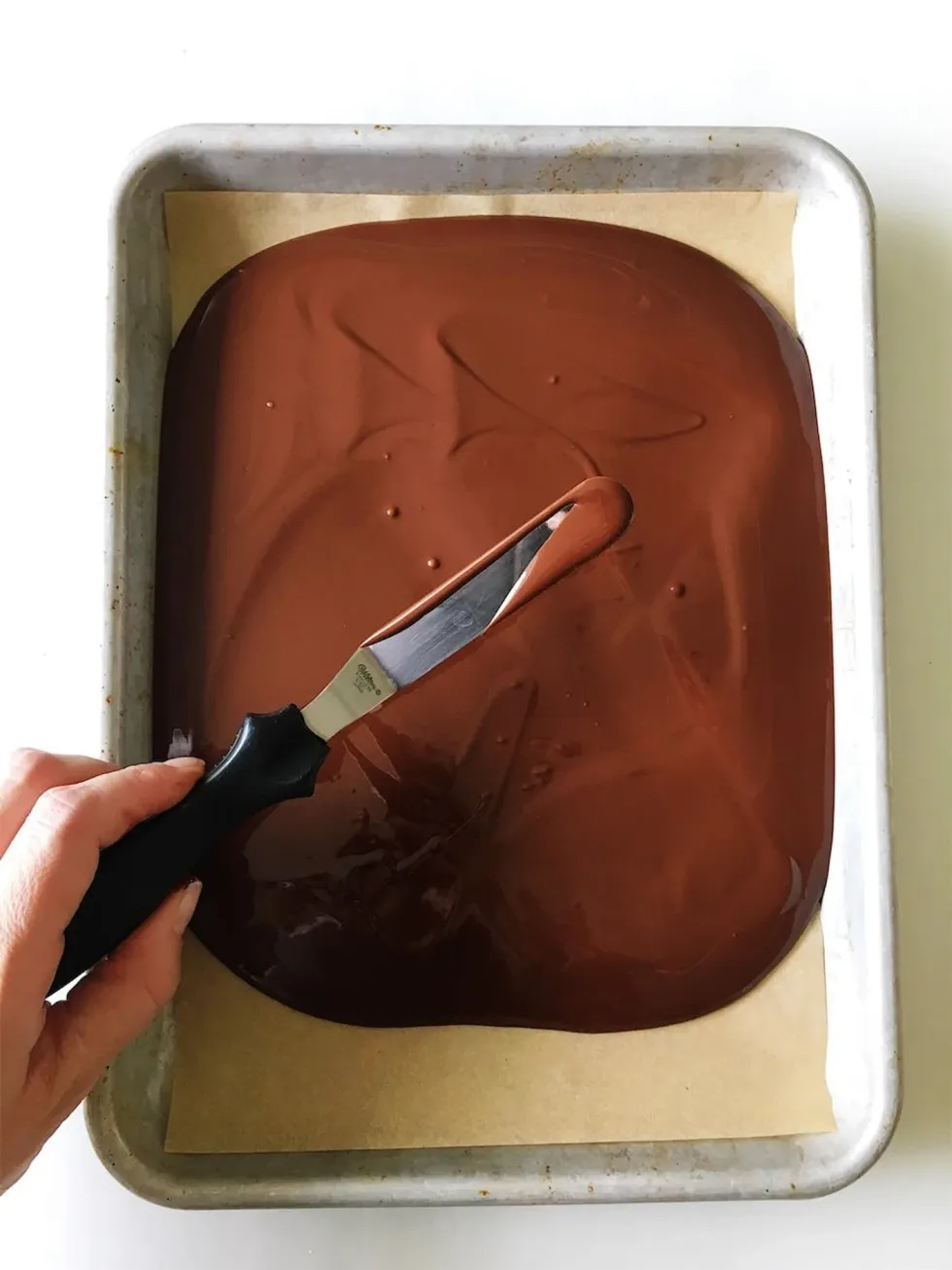 4. If the chocolate gets too cold to melt the rest, place it over the hot water again for just a minute to rewarm it. Do not rush this step. When all the chocolate has been melted, stir in 1 teaspoon of the peppermint extract.5. Use a small offset spatula to spread the chocolate into an even layer in a quarter sheet pan (9×13) lined with parchment paper. Set aside to cool (you can also pop into the refrigerator to speed the cooling).