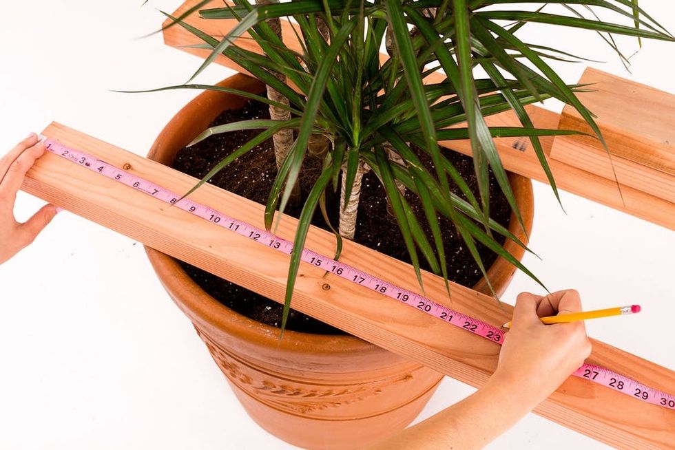 - Starting at one end, measure and mark 3.5 inches plus the diameter of the pot on each of the eight-foot pieces. Next, place one 15-inch 2×4 perpendicularly on either side of the planter, lining up one with the edges of the two eight-foot pieces and the second with the marks you just created. This will create a rectangle with the two eight-foot 2x4s. Complete this step on both sides of the planter.