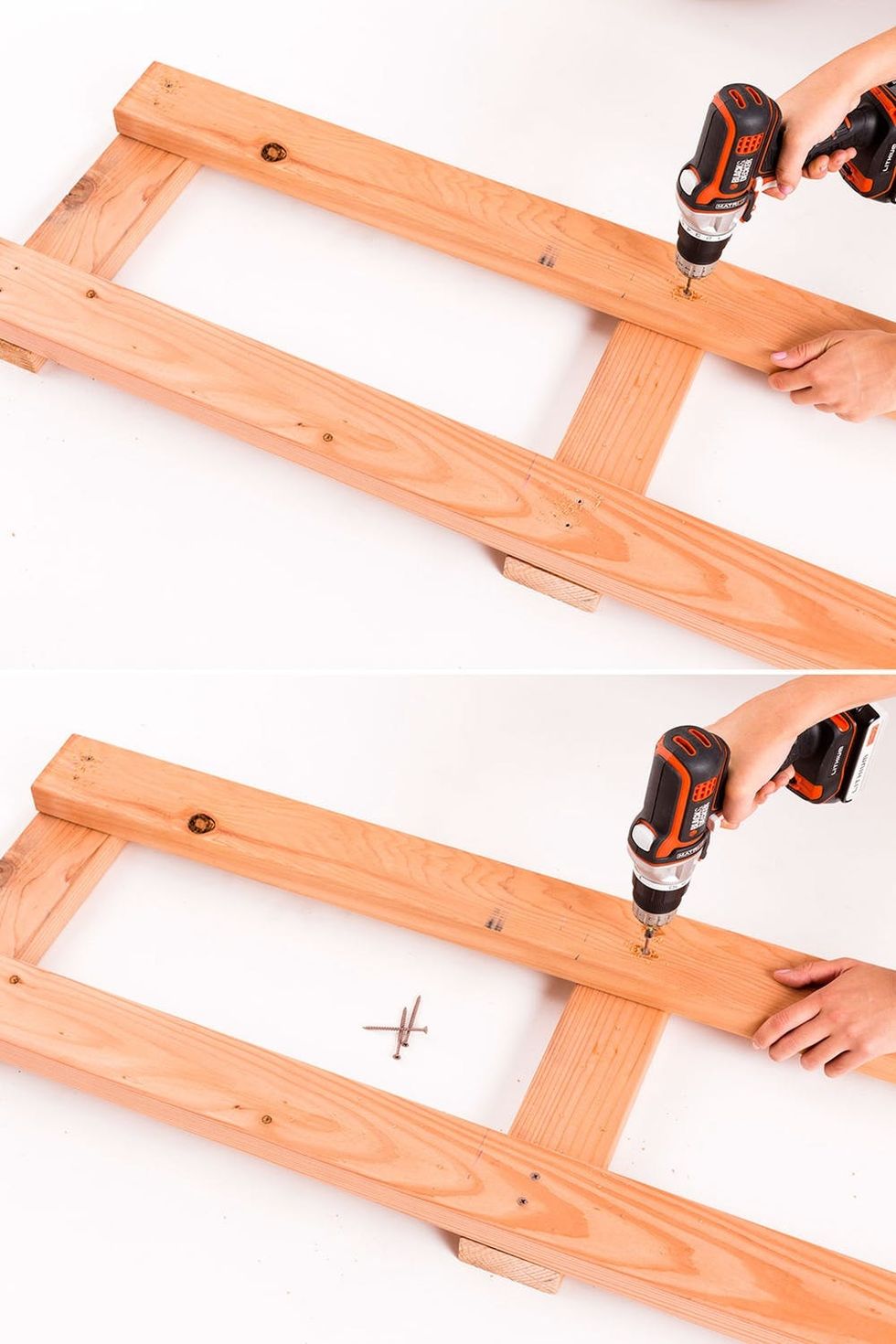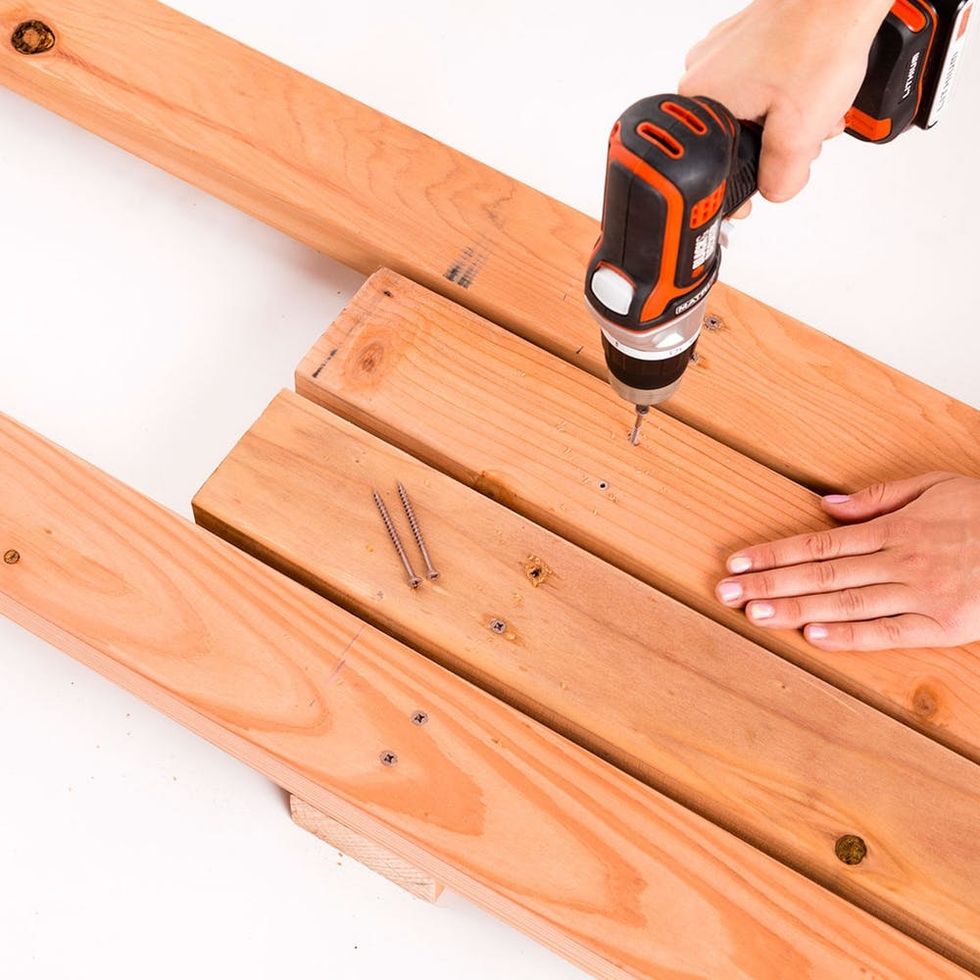 Drill and then screw into the 15-inch 2×4. Again, complete this for both sides of the bench.
