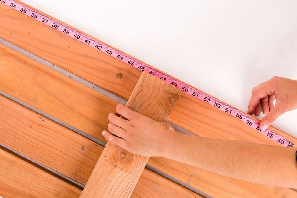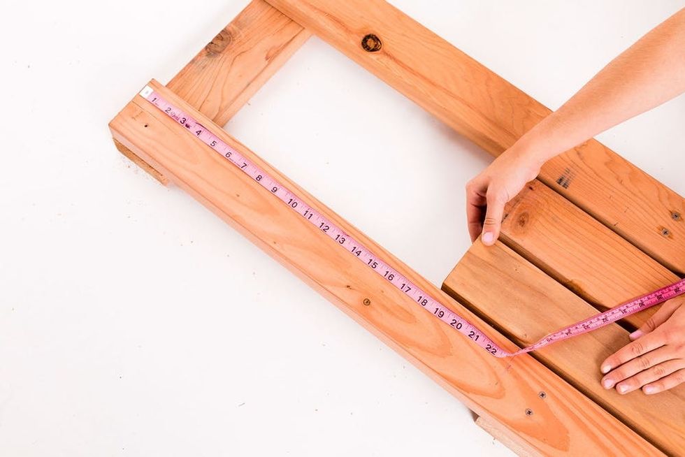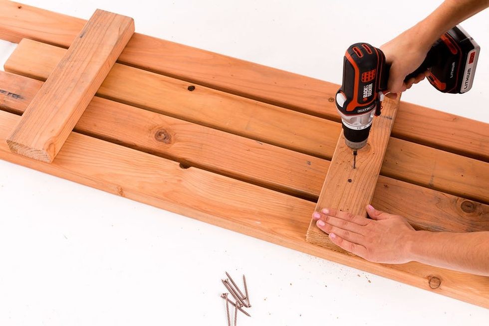 - Measure 18 inches from the edge of the eight-foot 2×4 — line up the five-foot boards with this mark. Space the two five-foot boards evenly between the two eight-foot boards. Drill and screw into place on each end of the bench.