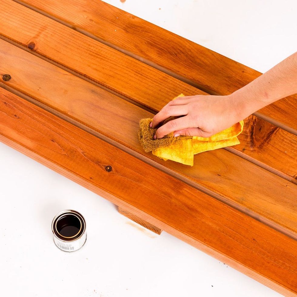 Time to stain this bad boy! No need to buy a whole can of stain — this was a free sample and was just the right amount. Dip a rag into the stain and rub it onto the wood.