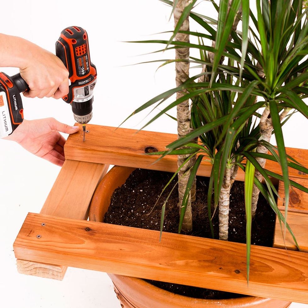 Starting at one end, measure and mark 3.5 inches plus the diameter of the pot on each of the eight-foot pieces. Next, place one 15-inch 2×4 perpendicularly on either side of the planter, lining up one with the edges of the two eight-foot pieces and the second with the marks you just created. This will create a rectangle with the two eight-foot 2x4s. Complete this step on both sides of the planter.