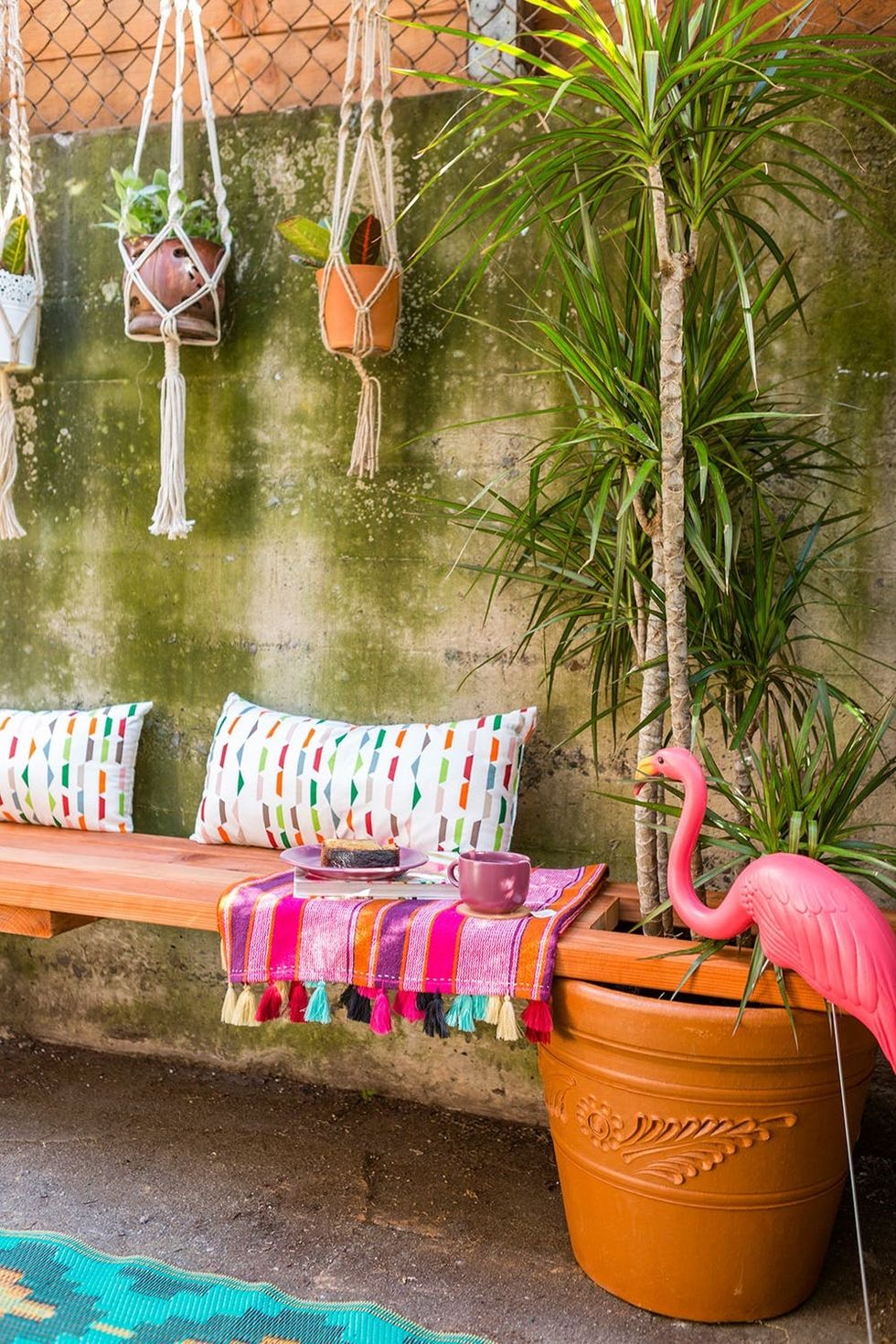 We slid this beauty into my backyard where all I have is a small little walkway to the garbage room and a teeny bit of space for a small patio table. This bench is the perfect way to add more plants to a space while providing seating.