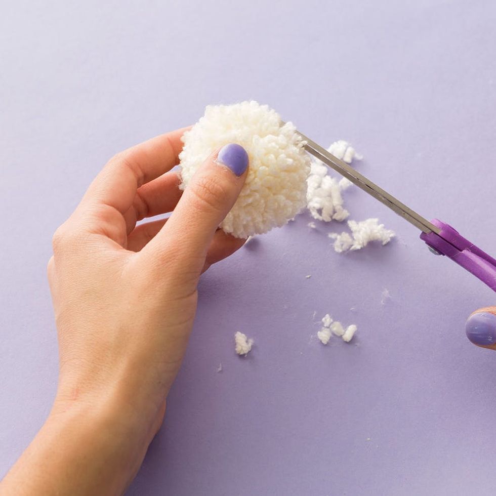 Wrap yarn around your hand to create a tassel. Tie tightly onto the pom-pom and then trim.