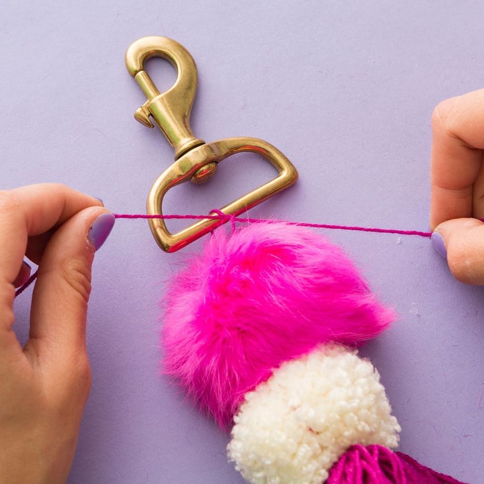 Hot glue pom-poms on top of each other and tie onto your key chain hook.