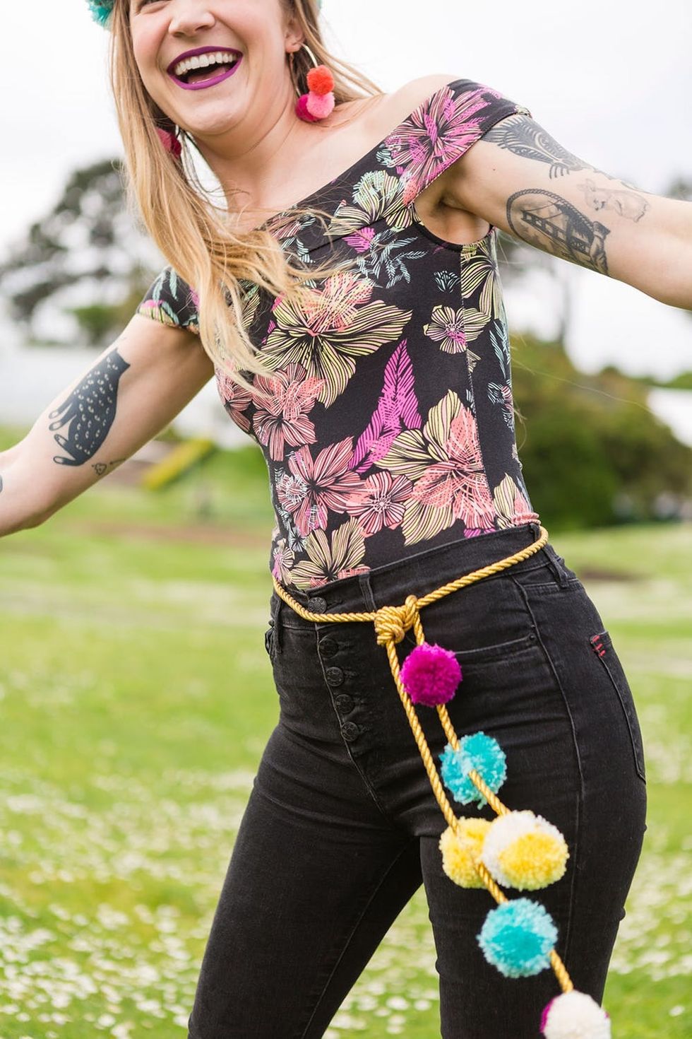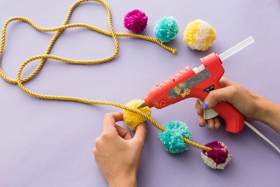 Hot glue onto a rope to create a pom-pom belt. It’s so cute, and a great accessory to accent the waist of any romper.