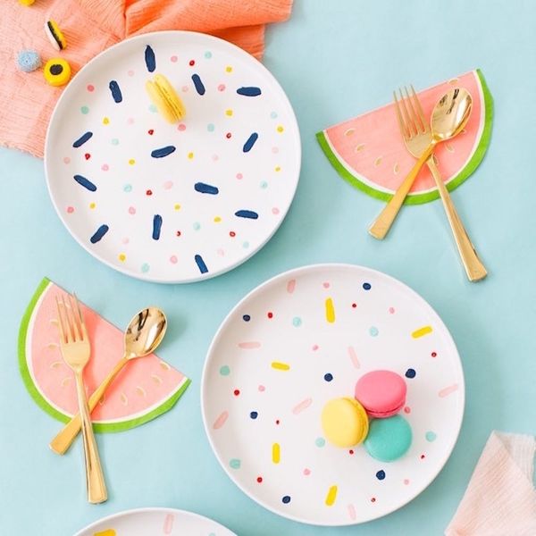 13. Confetti Placemats: These are the easiest party DIYs, like, *ever.* With colorful paints, Q-tips and white plates, you can make these fun confetti placemats. (via Sugar and Cloth)