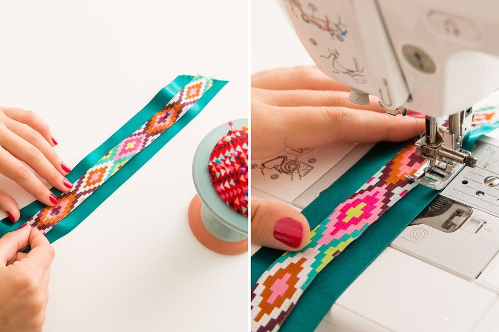 For the waist band you will want a ribbon that is about 1.5 – 2 inches in width. We fell in love with this aztec patterned ribbon but it wasn’t thick enough! Simple solution – sew to a piece of ribbon that is thick enough!
