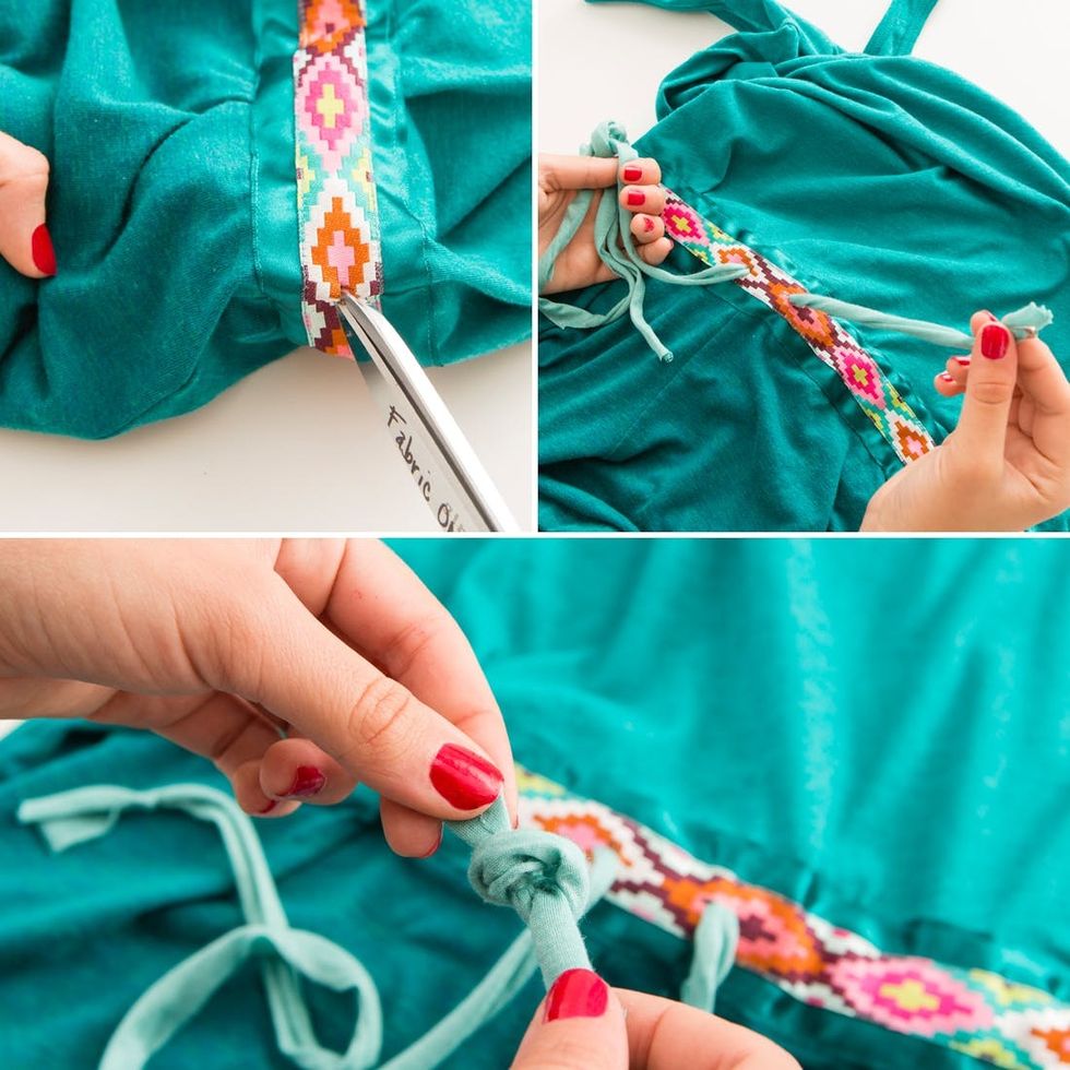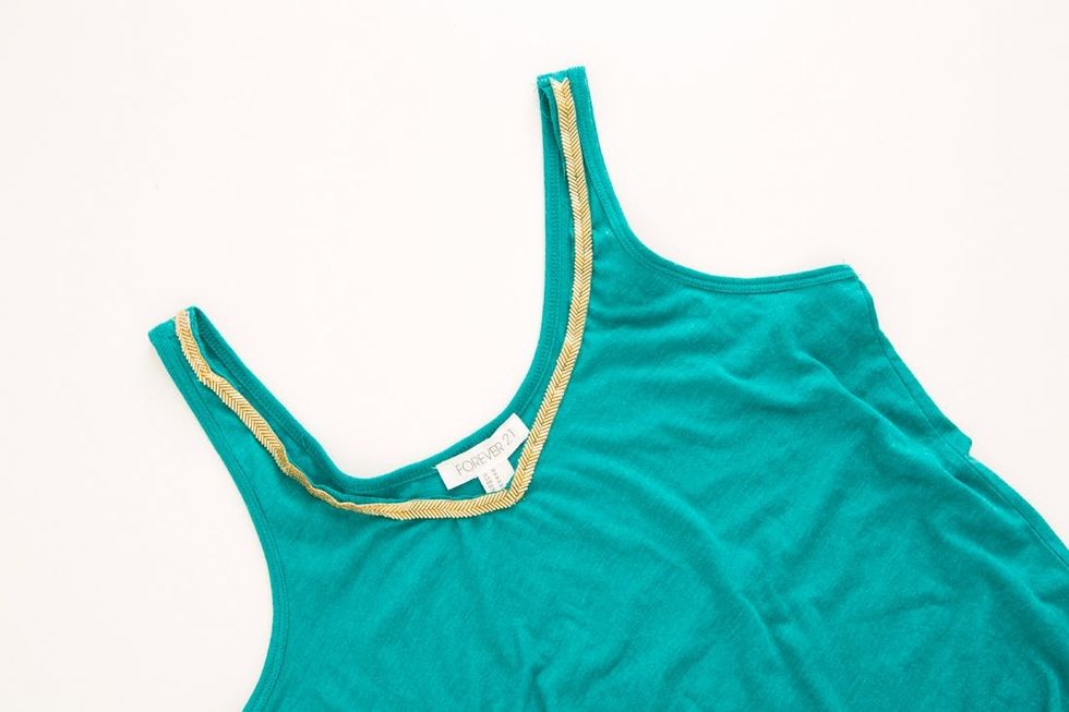 When we laid our eyes on this chevron gold beading we just knew that it was perfect for this romper. Pin the beading in place and hand sew onto the collar of your tank. We used the beads to turn our scoop neck into a v-neck. Trim away the extra fabric. We suggest skipping this step if you are a beginner because it is very tedious.