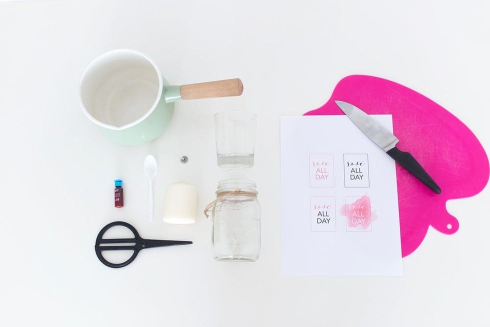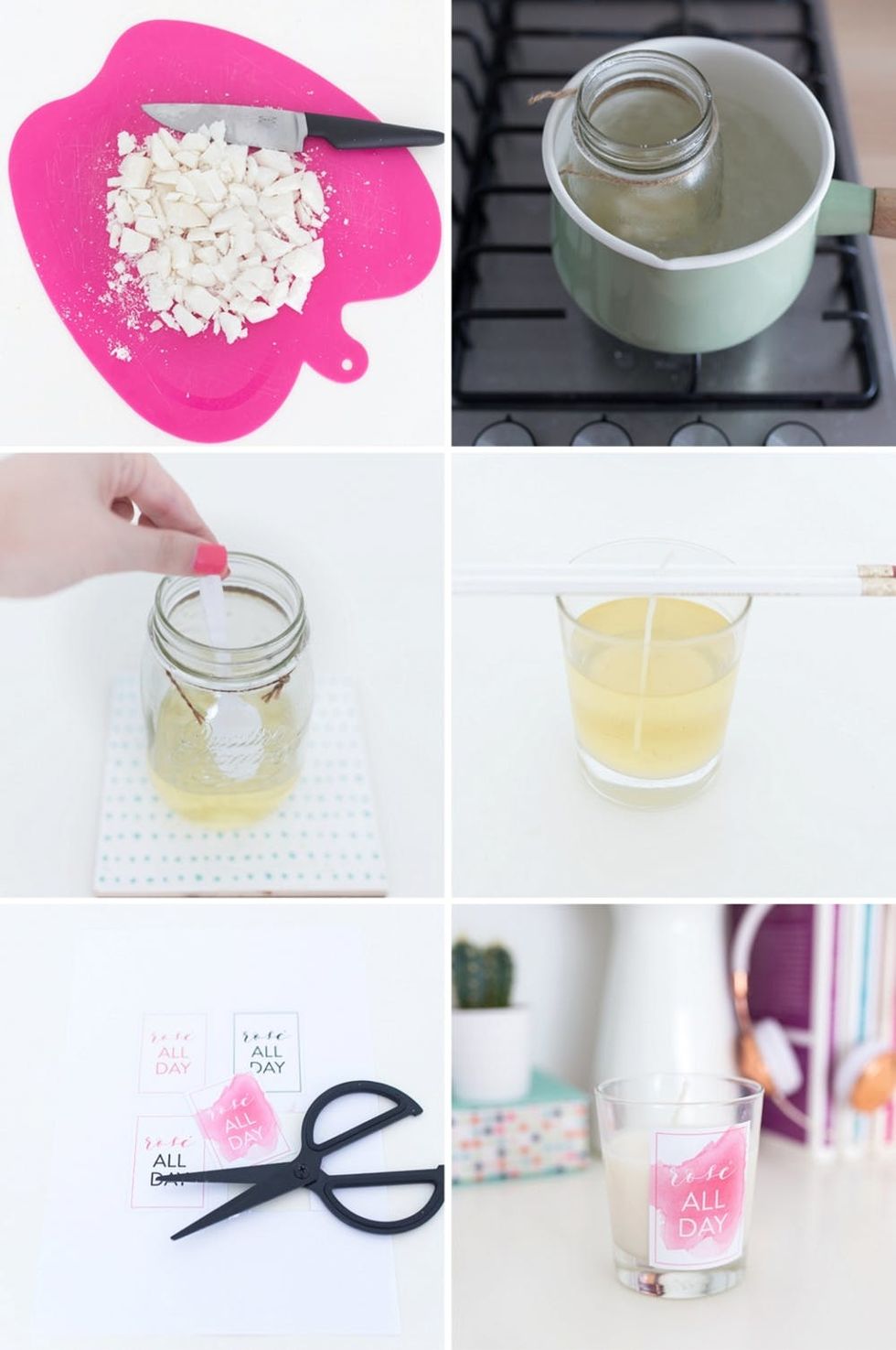 First use your knife to cut your unscented candle to create small pieces that are easier to melt. Then set up a double boiler system on your stove top and melt the candle. Remove the wax from the heat and add your fragrance oils. I’ve tried to recreate the rosé scent using two drops of rose oil, two drops of blonde woods, and one single drop of white musk. Stir and pour the wax into the glass, allow the wax to sit for 30 seconds, and then drop in the wick. I used a chopstick to help push the tab down to the base of the container and center it, then placed two pencils as shown above to be sure the wick didn’t move. Once the candle solidifies, download, print and cut your fave label. Then glue it and you’re done!