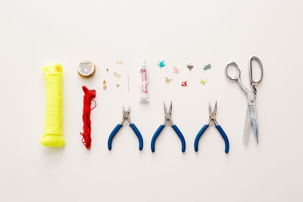 Cut a small piece of artistic wire (no roller coasters for this one!) about three inches long or you can measure the top part of your wrist. Add a crimp bead to the wire, then make a small loop at the end of the wire and place the end into the crimp bead. Clamp that baby shut using your needle nose pliers. Now it’s time for the beads! Create a fun pattern or mix of colors with your seed beads. When there is about a 1/4 inch of wire at the end, add another crimp bead and make a loop just like you did on the first side. Crimp it shut.