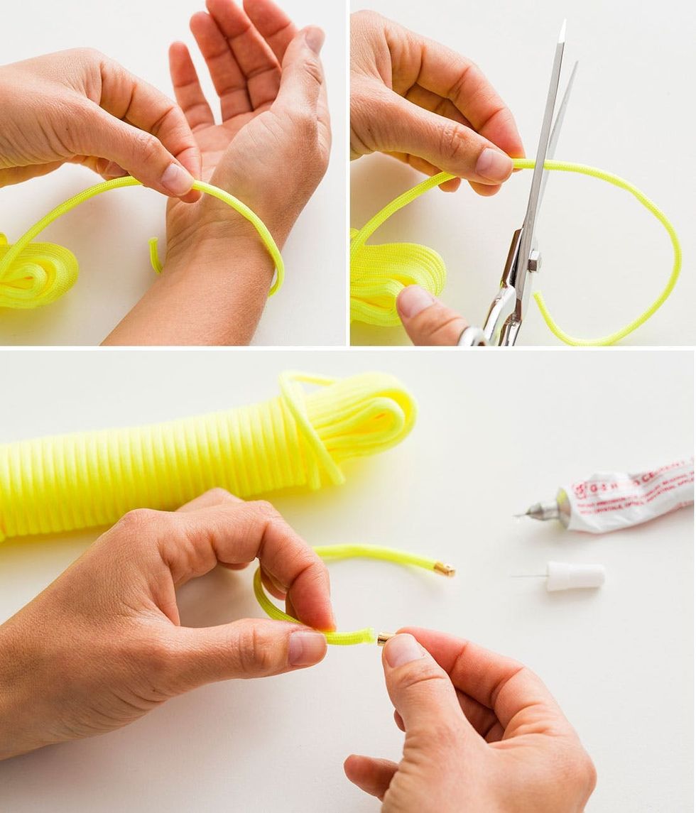 First off, measure the length of your paracord by wrapping it around your wrist. There will be findings on the ends, so cut it a little bit shorter to account for the jump rings and clasp. Then add a little bit of GS Hypo Cement and a cord end to each side.