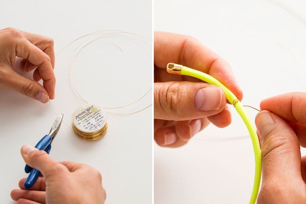 4. Wrap the end of the artistic wire tightly around the paracord three times about an inch from the end.