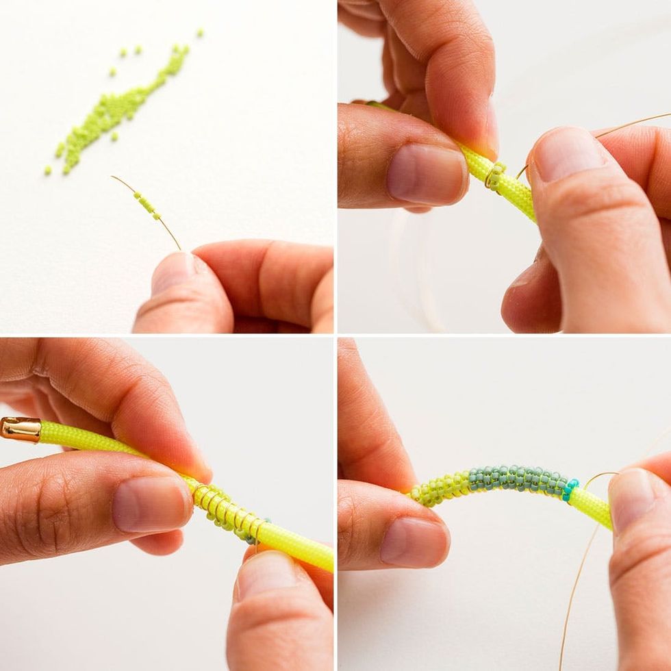 Now it’s time to add your beads. First place five beads on the wire and then watch them roller coaster their way down the wire to the bracelet. It’s like one of those toys in the waiting room at your childhood dentist’s office. Remember those? When the beads reach the bracelet, keep them next to each other and sit them on the top part of the bracelet. Then wrap the wire underneath. Now add four beads and do the same wrapping technique. Keep adding beads and feel free to change colors along the way!