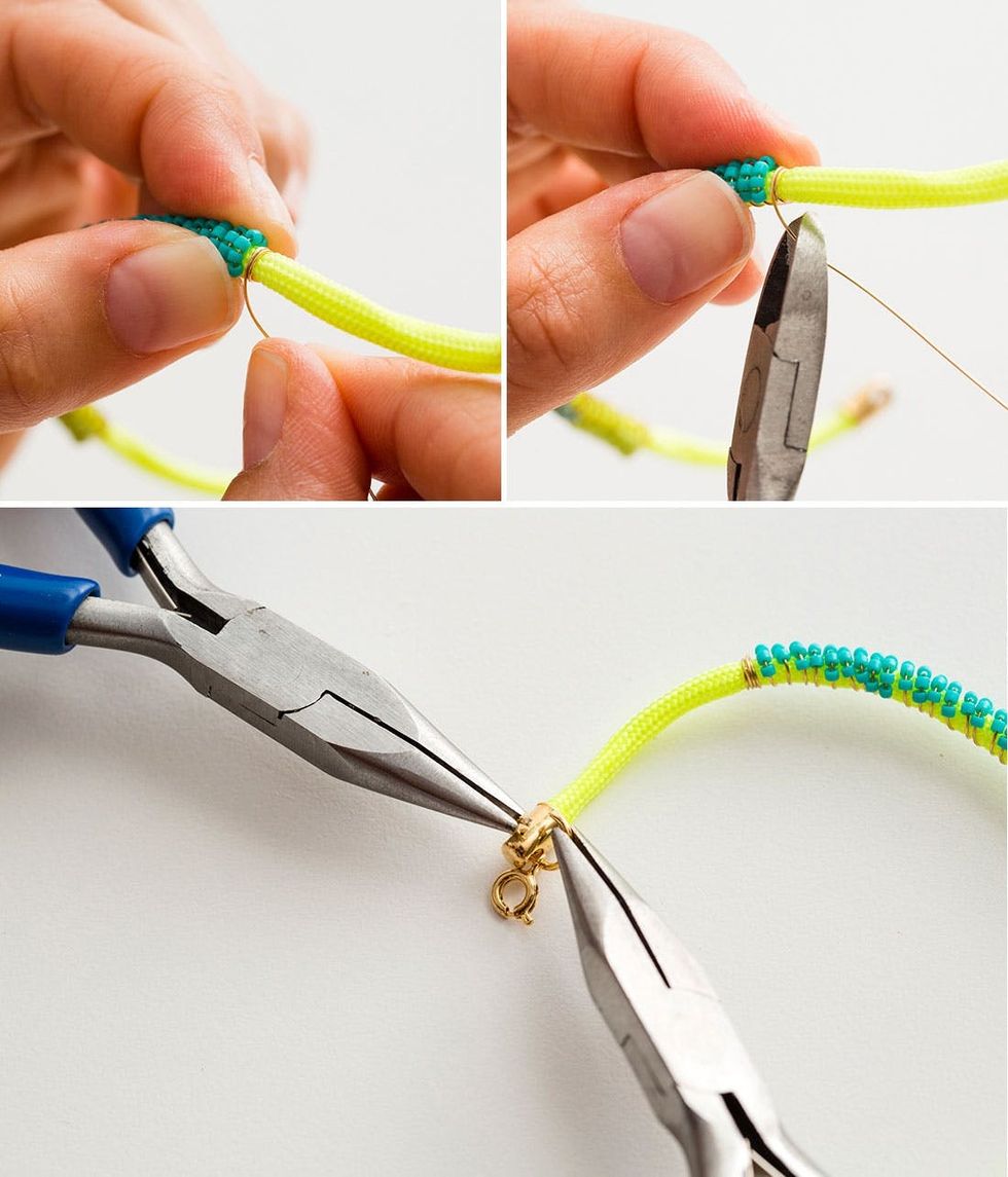 To finish off the bracelet, wrap the wire around the paracord three times just like you did at the beginning. Then snip off the excess wire. Add a jump ring to one cord and then a jump ring and clasp to the other end.