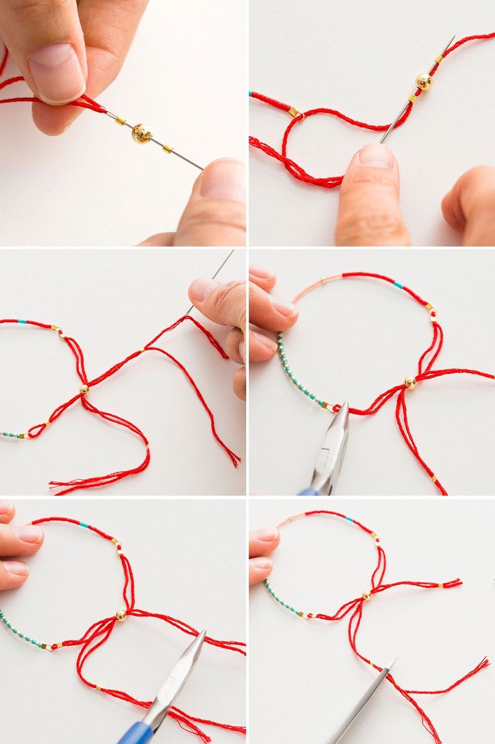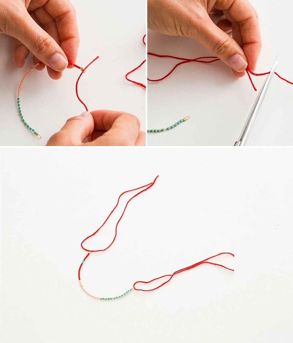 8. Clamp all of your crimp beads shut at the length you desire and then cut off the excess embroidery floss.