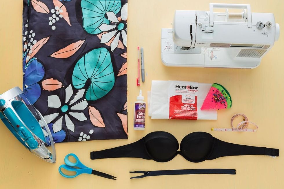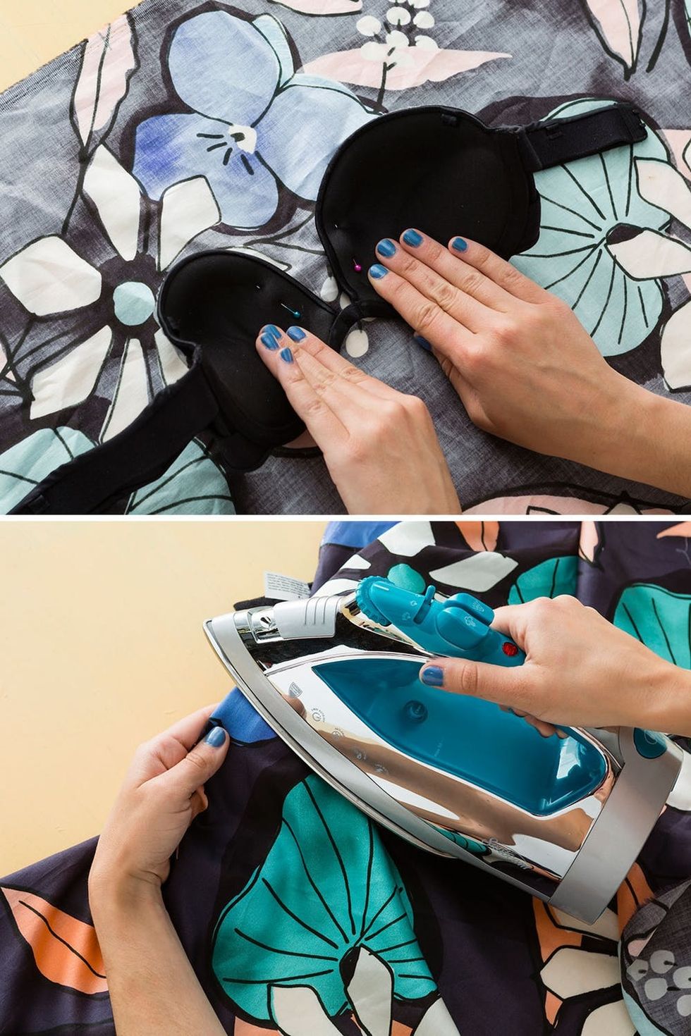 Find the center of the width of your fabric and pin the bra in place. Be aware of the pattern on your fabric — ours had giant flowers and we didn’t want one falling directly on top of the cup of the bra. Iron the fabric onto the bra once it is in place.