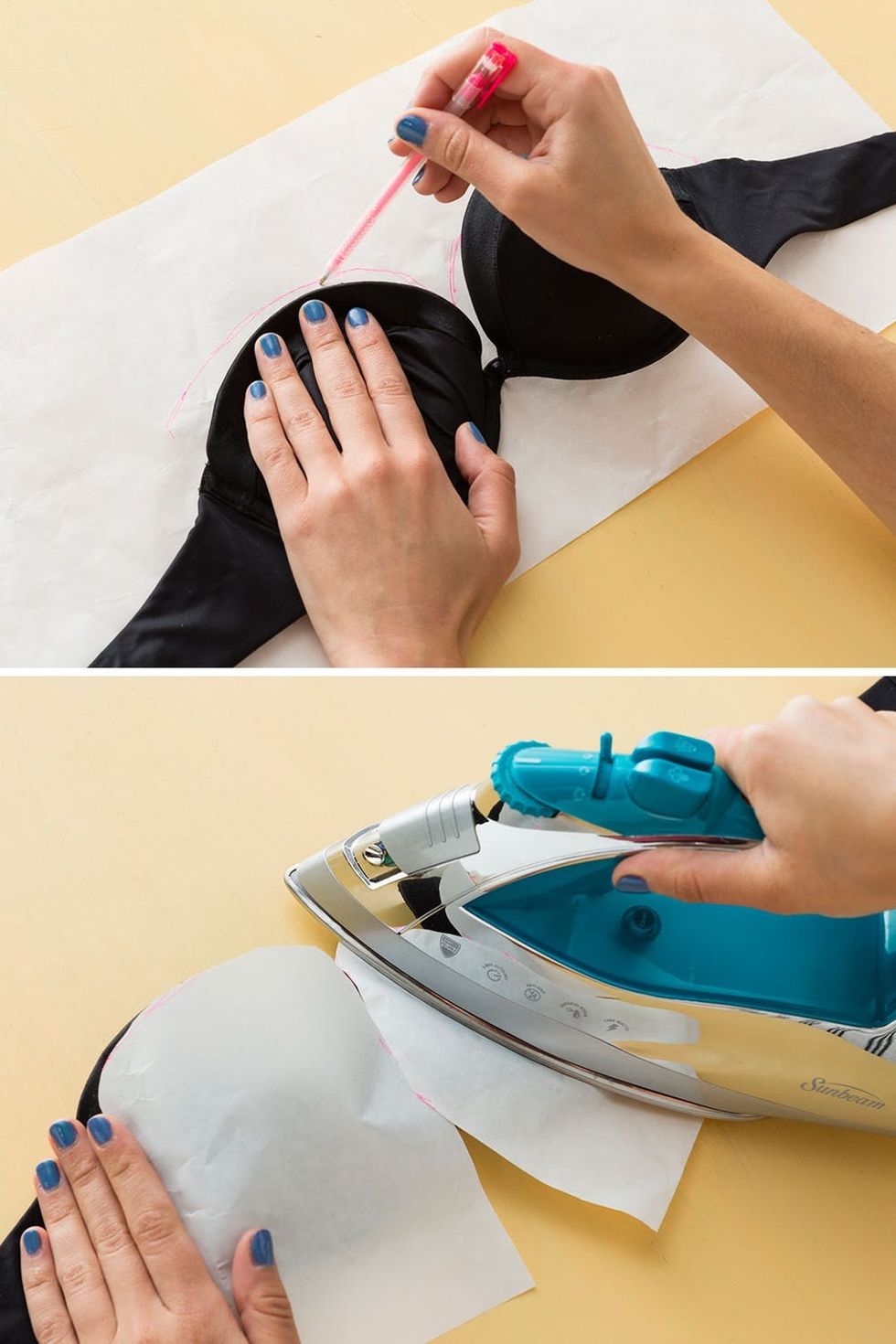 - Trace your bra onto Heat n Bond, and then cut out and iron onto your bra.
