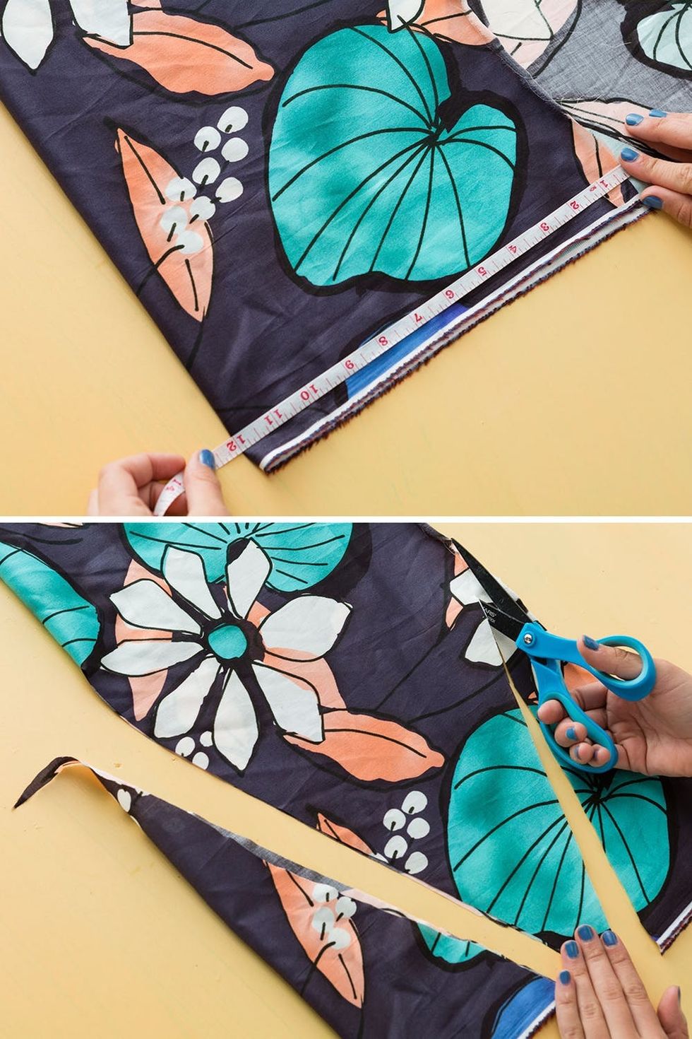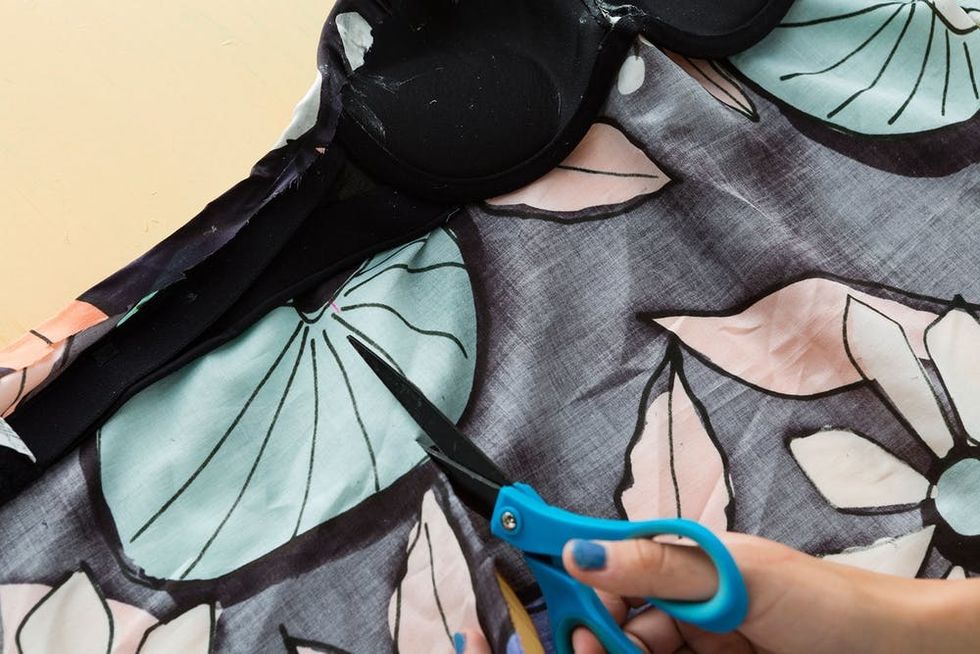 - On each side of the dress, make a mark on your fabric that is three inches from the cup of your bra. Use a measuring tape to create a straight line and then cut up the fabric until you are about two inches from the bra band.