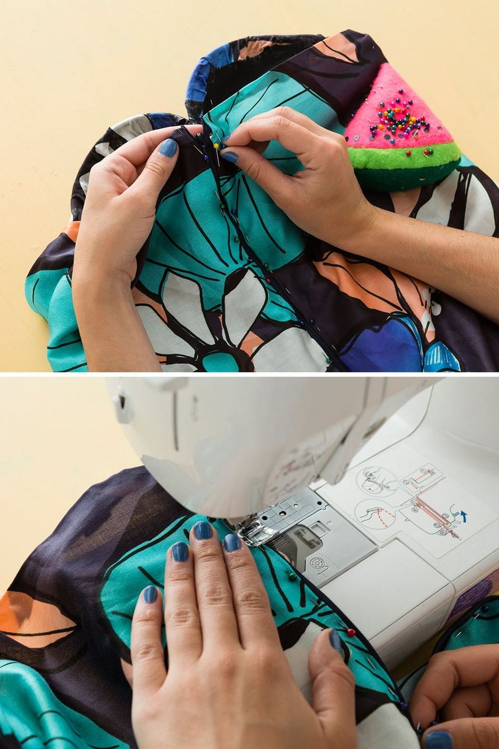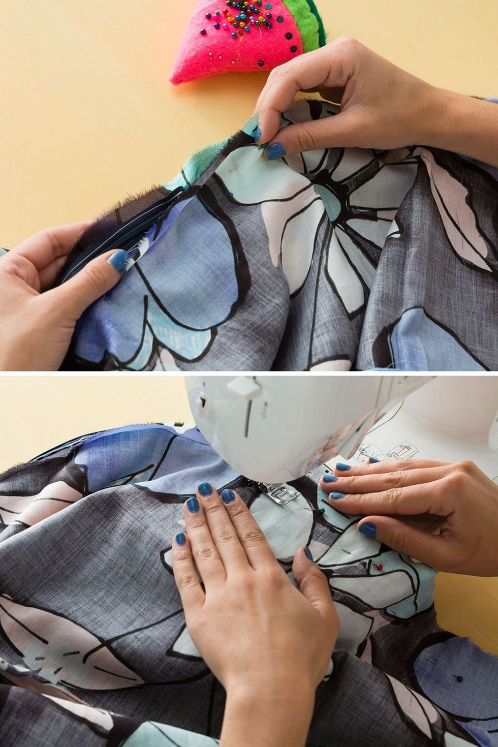 - Meet the extra fabric at the end of the zipper together, then pin and sew to complete the back seam of the dress.
