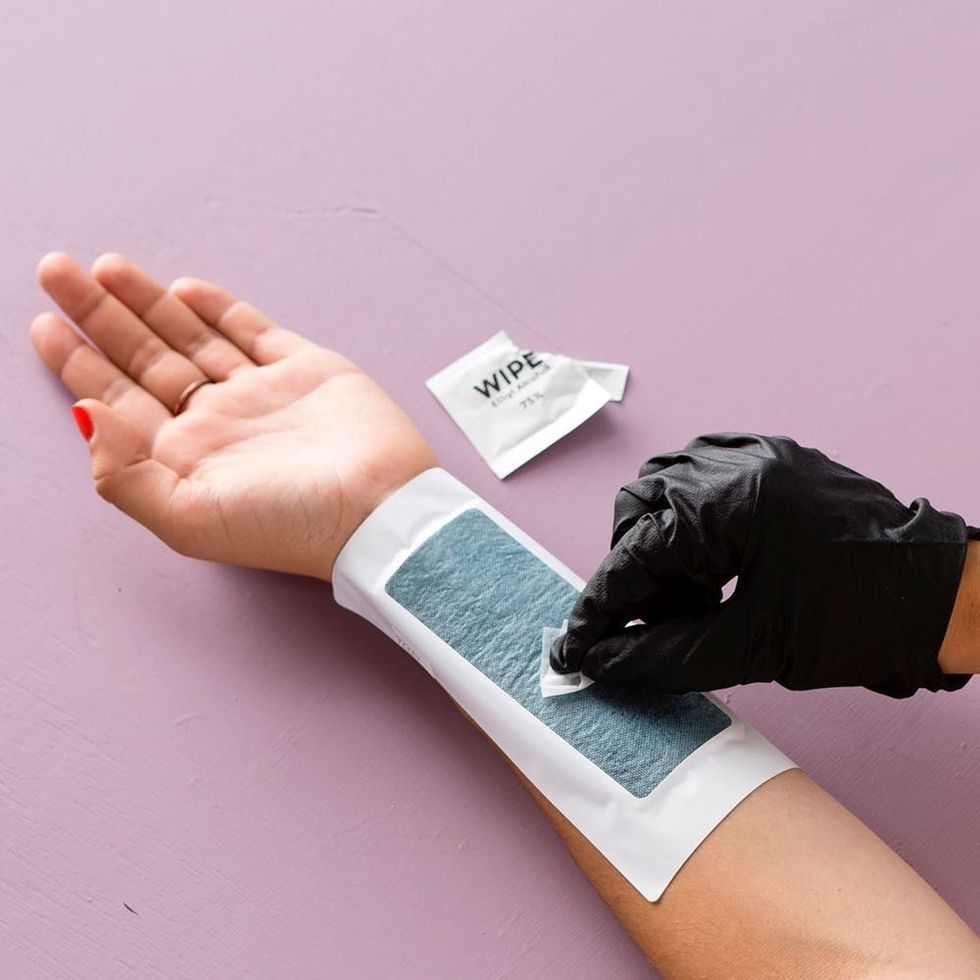 Microwave your provided cloth, fold in half, place on the tattoo, and press extremely hard for the first 30 seconds. Continue holding in place for the next 15 minutes. It is super important to not move the cloth. Since I am a multi-tasker, this was very hard for me. In return, I paid for the consequences in the results, which was a bleedy tattoo. Avoid my mistake — do not move the white cloth.