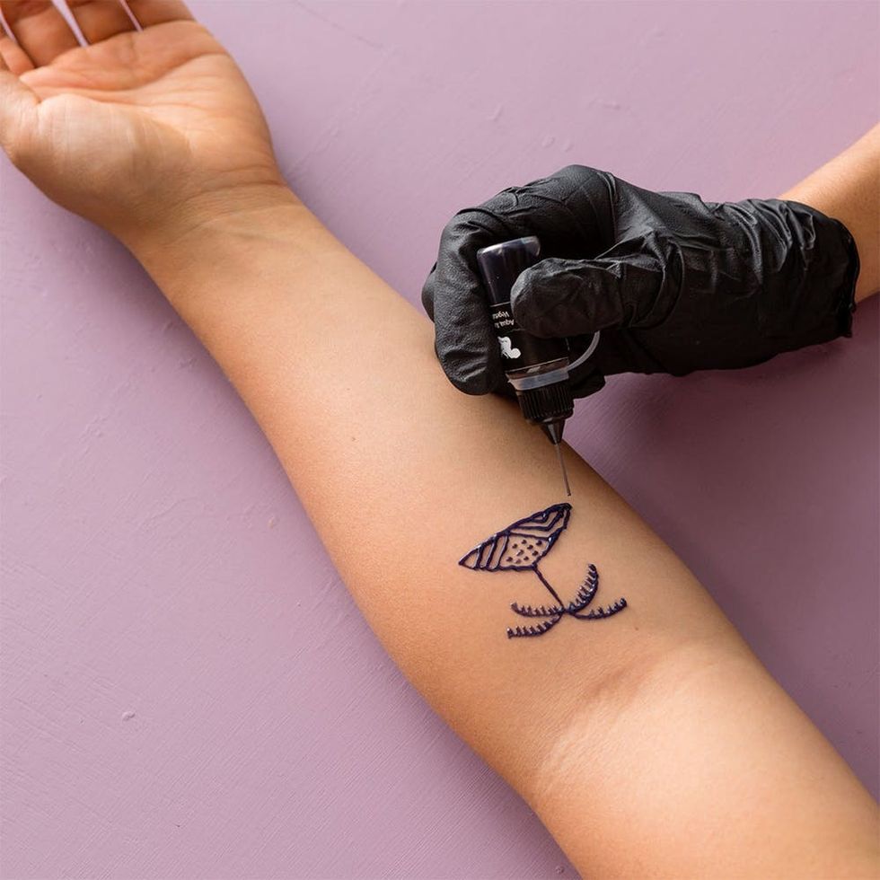 Another option Inkbox provides is ink for freehand drawing. This ink works just like henna — draw onto clean skin and wait an hour for the ink to dry. Once dry, peel it off and wait 24 hours for the tattoo to develop.