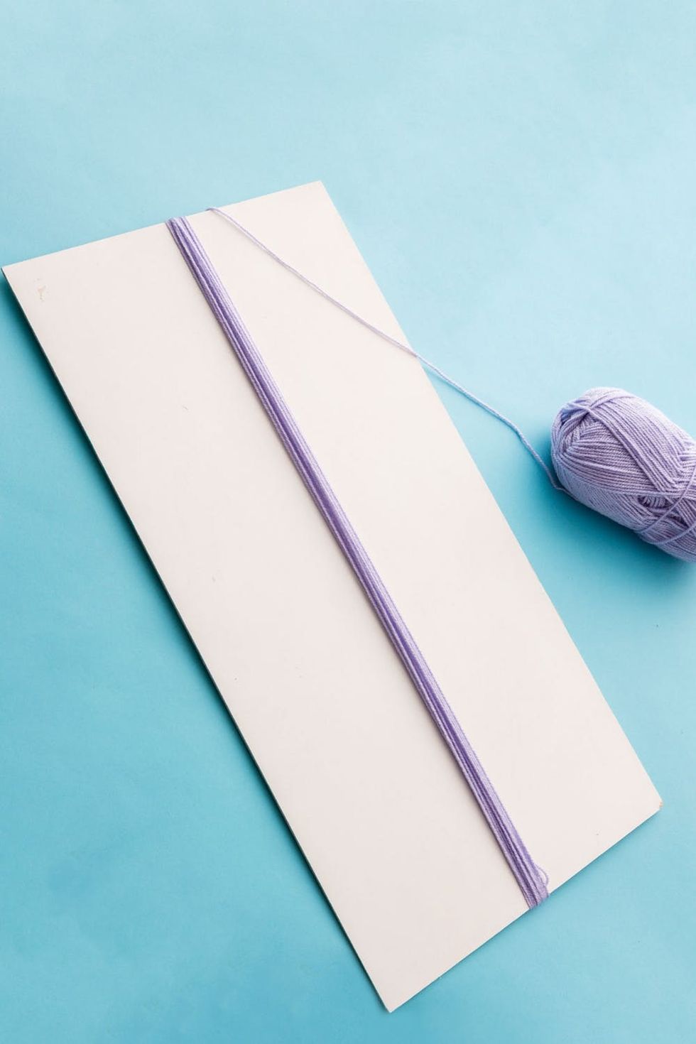 To make your next type of tassel, you’ll need to grab something flat, at least two feet long. You can really use anything — a plastic lid of a storage container, a wood block, or a piece of cardboard.