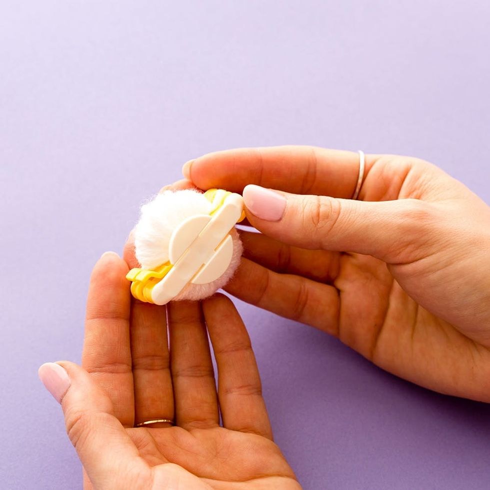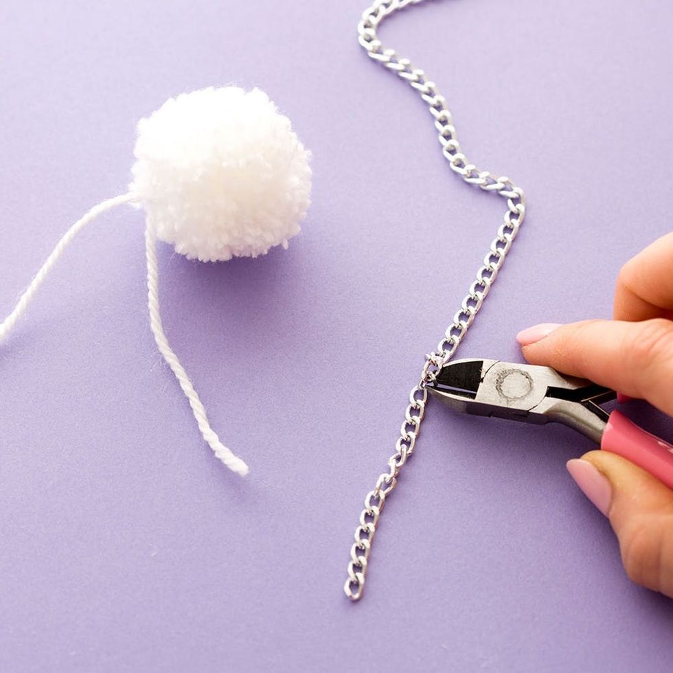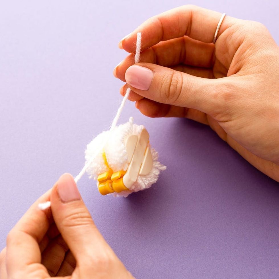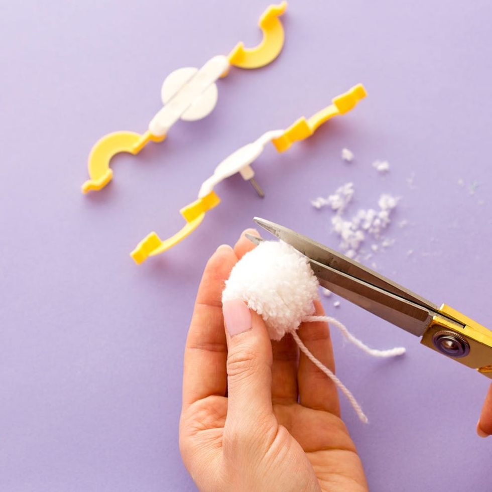 Remove the pom-pom from the maker by opening all the arms. Trim your pom-pom into the perfect little fuzz ball. Keep your two long center strings to attach the pom-pom to the chain.