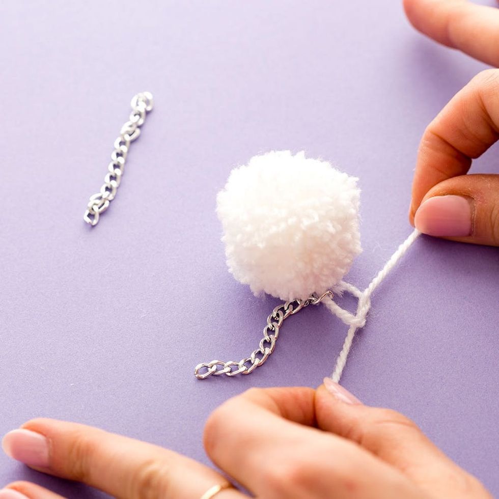 Attach the chain to the long center pom-pom strings by tying a knot.