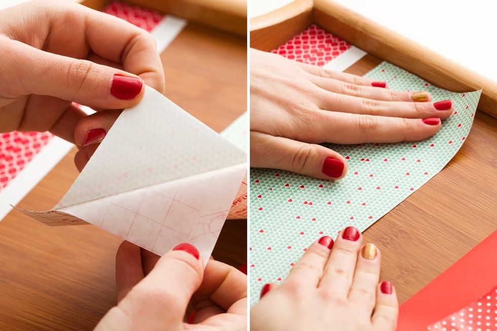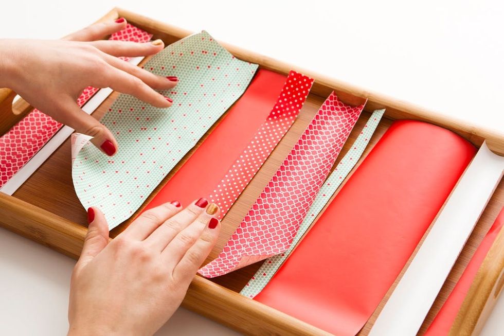 2. Cut strips of red and white contact paper to cover the tray. Cut the strips at different widths to create a fun pattern.