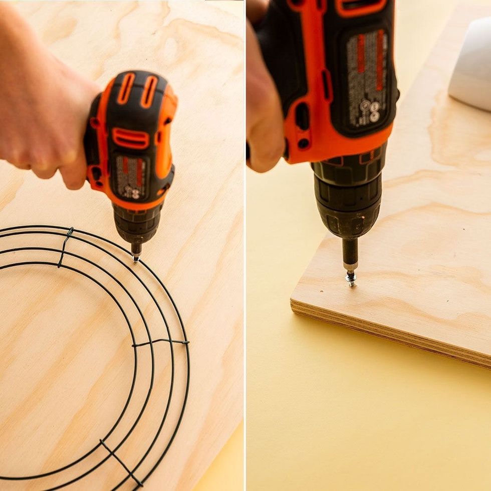 You'll need: a piece of plywood (22 inches by 27 inches by 1 inch), three cans of matte blush spray paint, wood screws, a drill, and organizing elements (i.e. wire wreath frame, tiny shelves, white planters or containers)