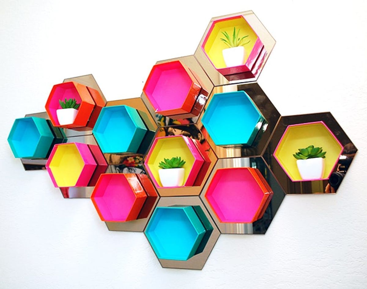 8. Hexagon Shelf: Hexagon shelves are a lot cheaper and easy to make than you might think. The hexagons are gift boxes from Target and mirrors are from IKEA! (via Jennifer Perkins)