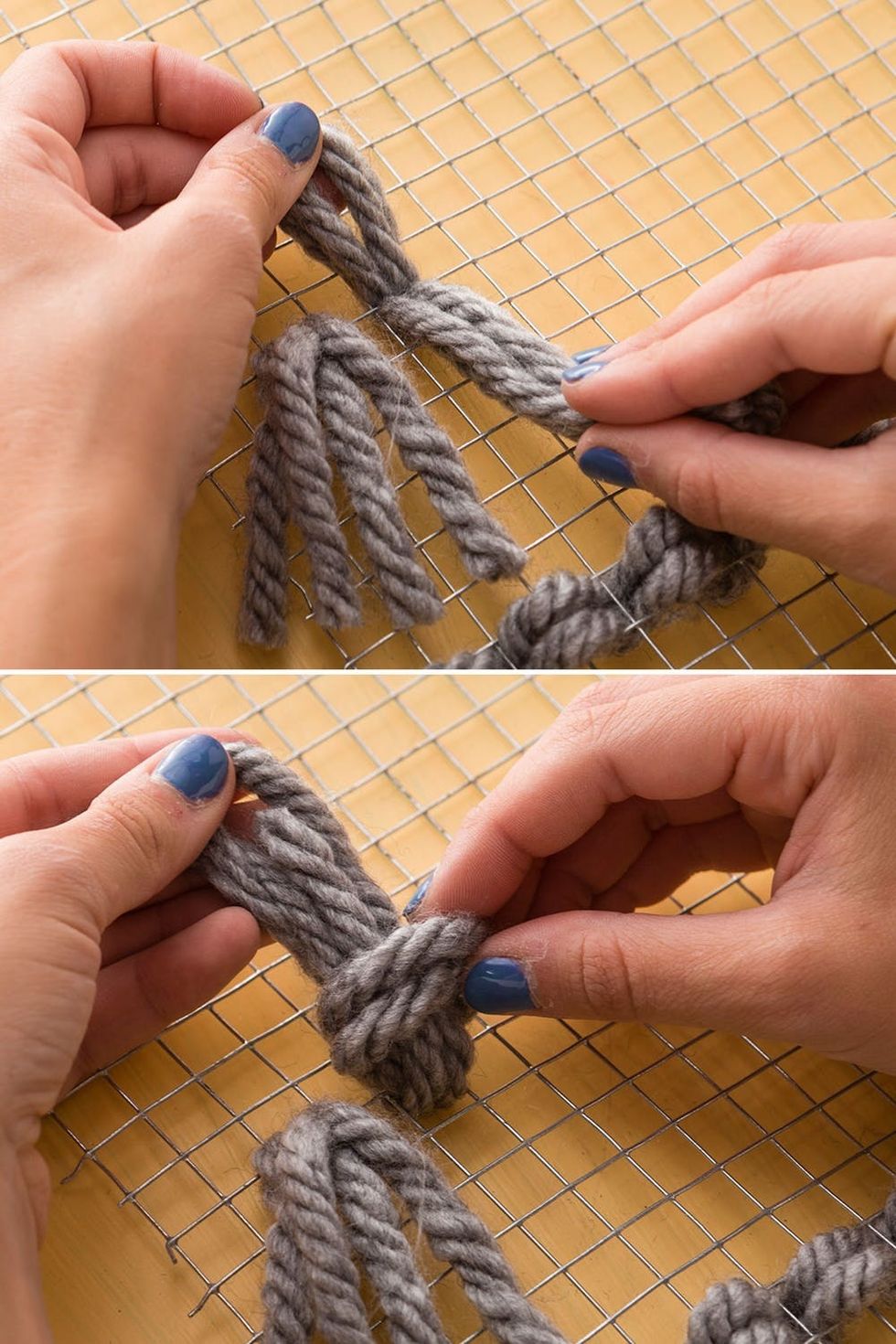 - For creating tassels, grab two 4-inch strands of yarn and weave through the grid. Send the ends of the yarn through the loop of the yarn and then pull tight.