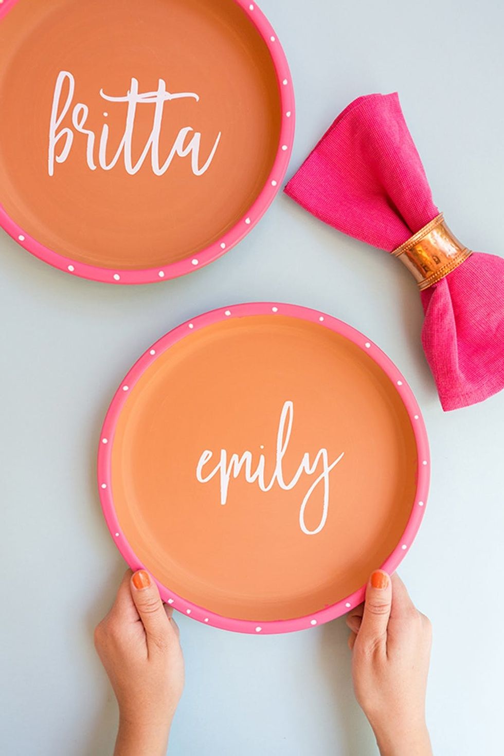 1. DIY Terracotta Plate Place Cards: If you’re hosting an intimate affair, add your guests’ names directly to the chargers in your place settings. (via A Coastal Bride)