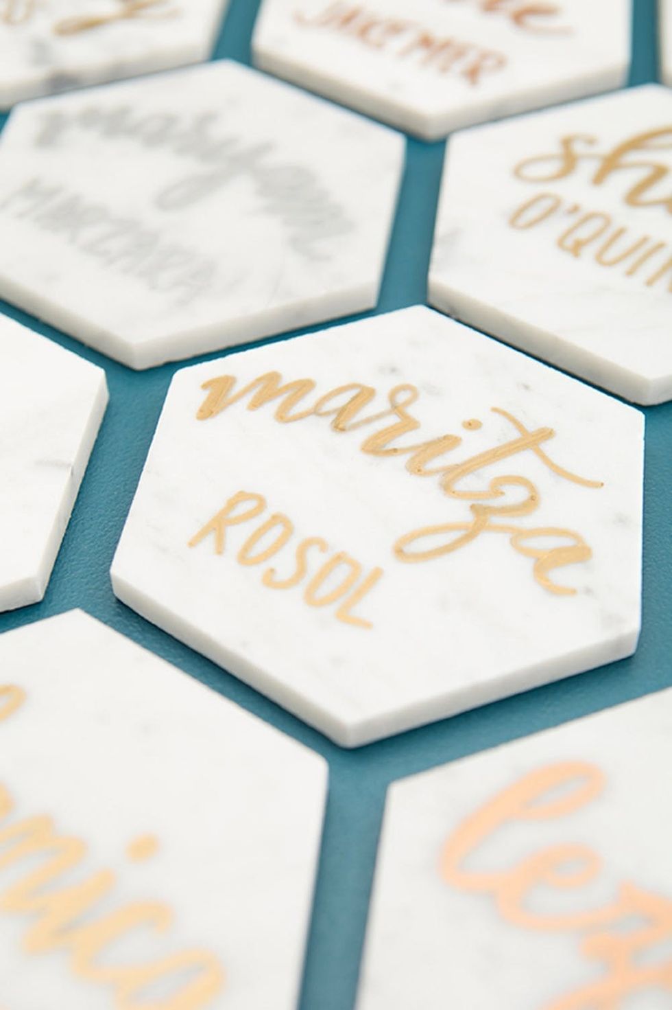 3. DIY Hexagon Tile Place Cards: Geometric tiles + gold Sharpie = one fabulous display. Even better: These make fabulous coasters, so you’ve got your favors checked off, too! (via Something Turquoise)
