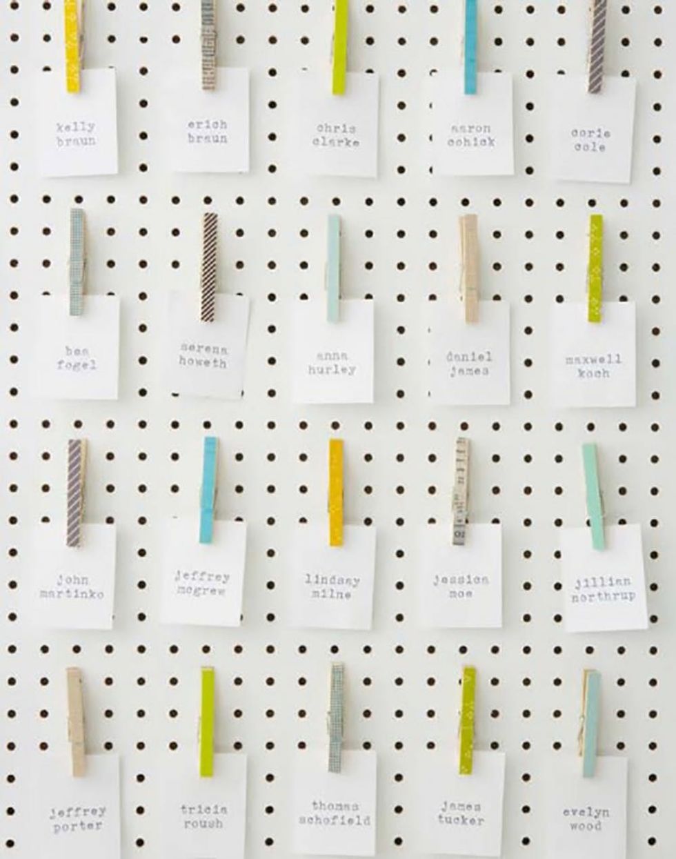 8. DIY Pegboard Escort Card Display: Talk about a modular piece of decor! You can repurpose this ingenious display for your home once your big day has come and gone. (via Brooklyn Bride)