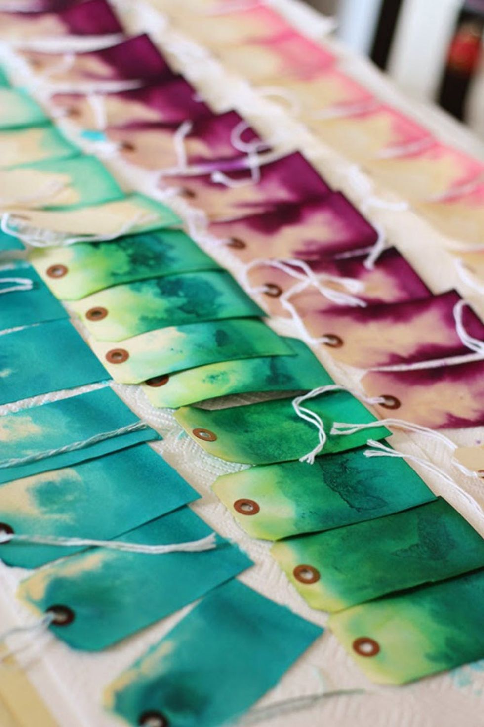 11. DIY Dip Dyed Gift Tag Cards: Dip simple paper tags into food coloring or dye and not only do you have the most-hands-off DIY ever, you’re going to have an absolutely stunning display. (via Aunt Peaches)