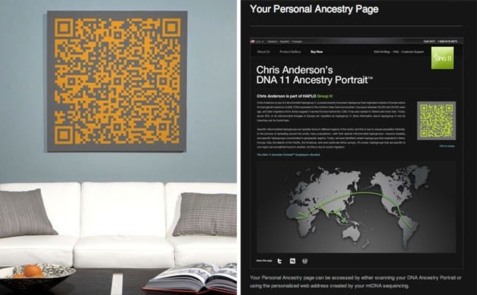And last, the ancestry portrait meets QR code. For $440, DNA 11 will use your DNA sample to extract your maternal ancestry and translate it into a sequence of numbers and letters. Then, they add that sequence to your unique serial ID number assigned by DNA 11 and generate a QR code. The resulting code is the portrait!. What’s even cooler is that when you scan the portrait, it’ll lead you to your personal ancestry page on the DNA 11 website.