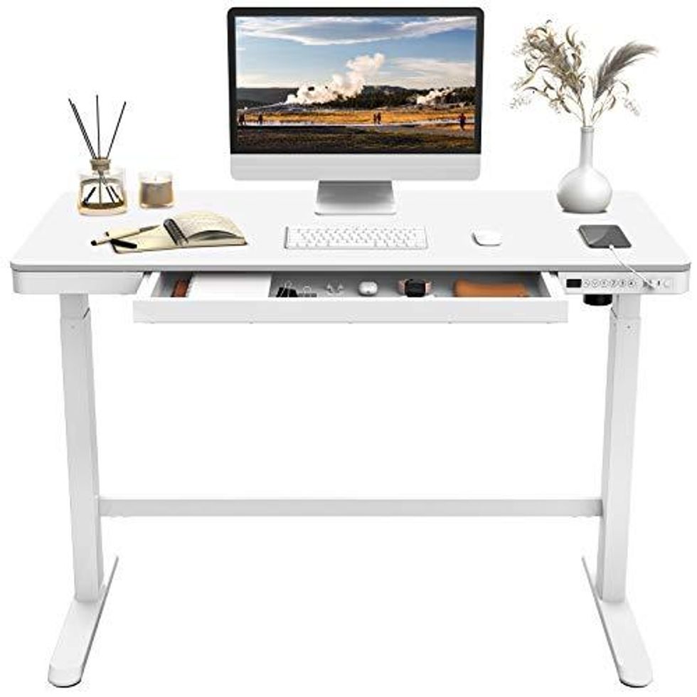 In addition to the Height Memory Pre-sets, the Integrated Control Panel has a Child Lock, USB Ports, and Up/Down buttons. The Electric Standing Desk has a height adjustment range of 28.3" to 47.6" and a weight capacity of 110 pounds. The desk is offered in Wood, Glass, or Bamboo and various colors. 81% of customer reviews are 5 stars.