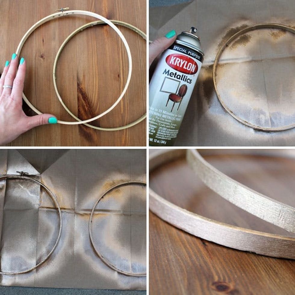 Spray paint gold and let dry. For the hoop that has the clasp or fastener at the top, you can either leave that or remove it using pliers. If you do this, use wood glue or hot glue to attach the two separated ends.
