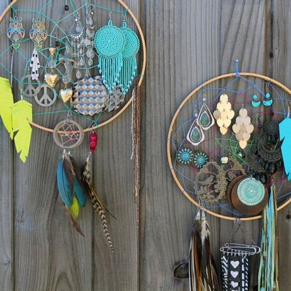 Oh, the art of the dreamcatcher. Boho chic DIYers and fashionistas alike love borrowing this Native American object, known for protecting folks from bad dreams. Good dreams are meant to pass through the webbing and slide down the feathers to the sleeper. Well, we’ve co-opted the classic dreamcatcher for our own organizational tricks: The DIY Dreamcatcher Earring Caddy!
