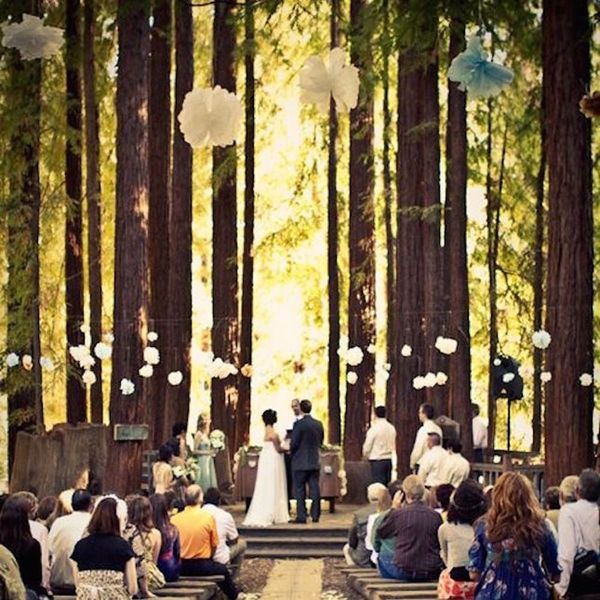 15. Hanging Flowers: Love the hanging lights trend but not having your outdoor wedding in the evening? Here’s a great alternative: Just hang paper flowers from the trees and they’ll frame your ceremony beautifully. (via Jessica Velarde)