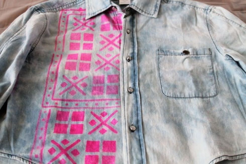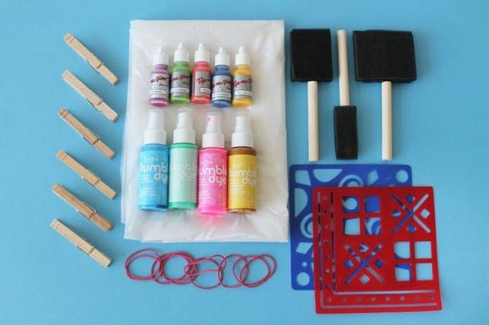The classic denim or chambray shirt is a year-round staple. But what happens when you find yourself with one too many faded button-downs? Tie dye happens! We busted out the supplies from last month’s Ombre ScarvesBrit Kit and got to work on three tired chambray shirts using stencils, rubber bands, and brushes.