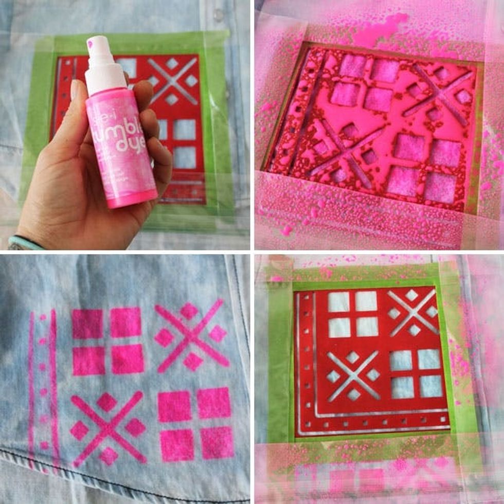 For this one, we used a stencil we found at our local craft store. Tape it onto your shirt with painter’s tape and use ziploc bags to protect the rest of the shirt while you spray. Spray the Tumble Dye and let dry for 5 minutes or so. Remove the stencil, rinse off, and then tape down again above where you painted the first one. Do this one more time, and you’re done.