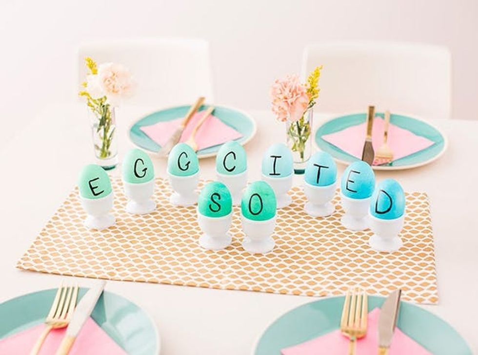 Punny Egg Centerpiece: All your decor should pull double duty by serving as part of a tablescape and by making you and the ones you're celebrating with LOL. (via Brit + Co)