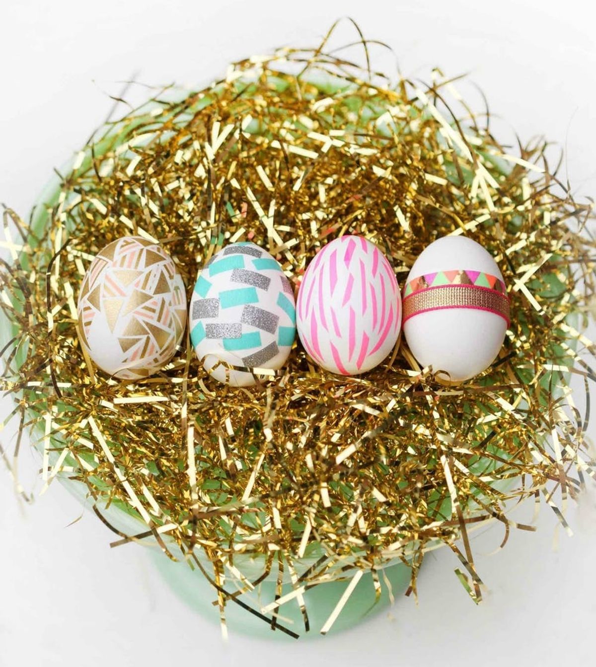 If you’ve got an artistic eye and a steady hand, you can recreate these graphic, metallic beauties. In fact, they’re so glam, you may want to use wooden “eggs” so you can preserve them for Easters to come. The eggs above were created using metallic leaf, Washi tape, ribbon, and spray adhesive. Get the whole how-to here. (Via Miss Renaissance)