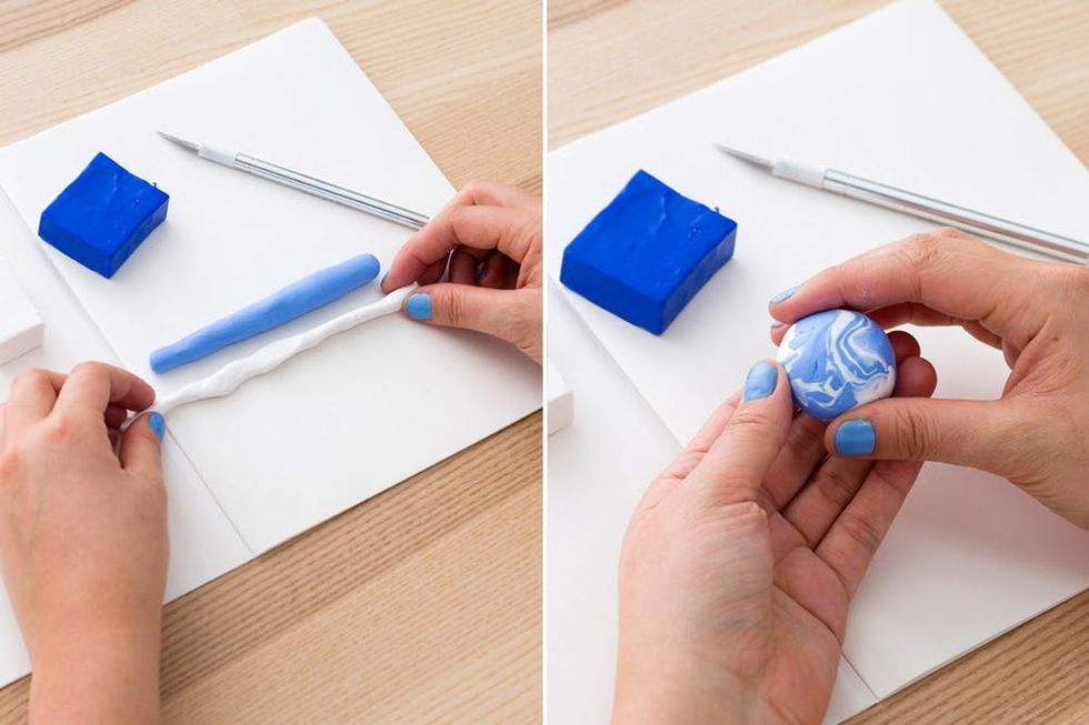 Roll your newly mixed sky blue clay and a half-inch piece of white clay into logs. Twist them together and roll the combined pieces of clay into a ball.