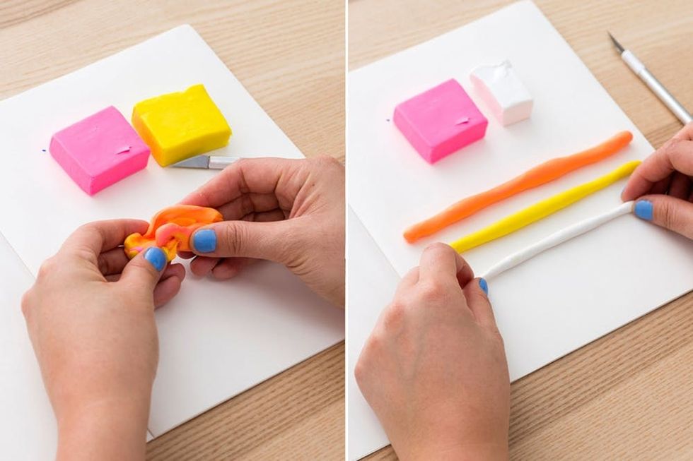 To make orange, cut about a quarter-inch from the pink block and from the yellow block. blend these two pieces together until the colors are no longer streaky. Roll equal parts orange, pink, and white into logs and combine them into a ball. Repeat the flattening and pinching technique in the previous step.