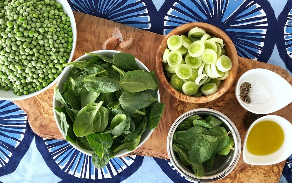 - Depending on the size of your blender, ladle about half of the soup into the container (half veggies and half solids). Make sure not to fill more than halfway (to avoid blender explosion and burns!). Add about half of the mint and half of the spinach leaves to the container. Close the lid, hold it tightly (cover with a cloth napkin if needed), and blend until smooth. Optional: While soup is blending, carefully drizzle about 2 tablespoons olive oil (per batch) for an extra velvety texture.