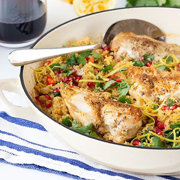 Seasoned with saffron, paprika, and cumin, and garnished with pomegranate seeds, lemon zest, and plenty of cilantro, this no-fuss, Moroccan-style chicken dish has a little bit of everything.